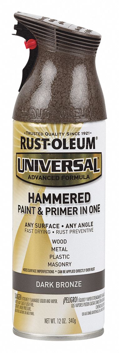 12-oz Rust-Oleum Universal Gloss Brown Hammered Spray Paint and Primer In One NET WT. Ergonomic grip and 360 degrees provide more coverage and a drip-free application. The sparkling metallic finish of this Rust-Oleum paint and primer in one brings surfaces to life.