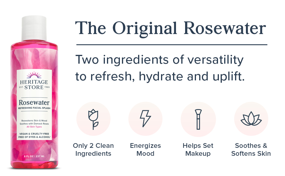 Refresh set hydrate and uplift. Spray liberally on skin after cleansing or after makeup to lock in your look. Heritage Store Rosewater is two ingredients of versatility.